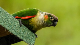 The population of many parrots is limited by the availability of nest cavities because so many trees have been cut down. A nest box program provides homes to these birds like this rare White-breasted Parakeet until the forest can regrow. Photo: Byron Puglia.